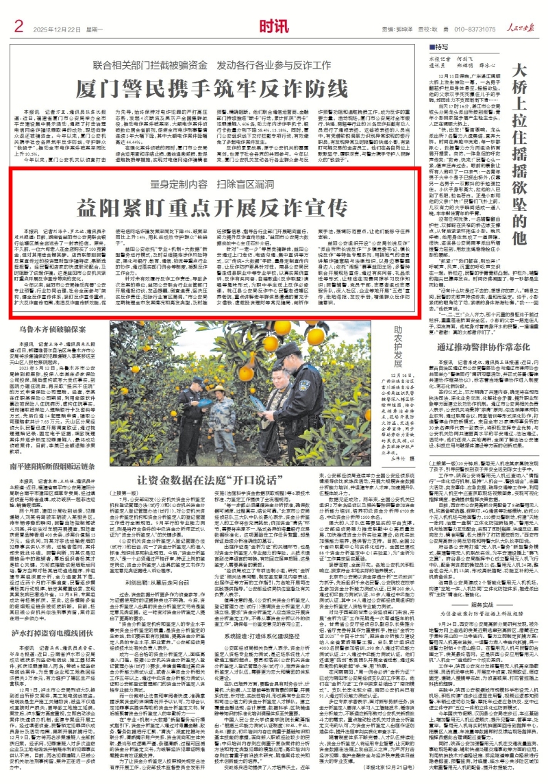 益阳公安组织开设“公安局长说反诈”“派出所所长说反诈”“乡镇党委书记、镇长说反诈”等特色专题系列,用接地气的语言讲解诈骗套路与法律知识,以身边事警醒身边人;依托“湘超”赛事益阳主场,多警种联合开展现场宣传,通过有奖问答、礼品派送等形式,让球迷在观赛间隙学习反诈知识;民警辅警、党员干部、志愿者组成志愿服务队,深入社区、企业等地开展“五进”宣传,张贴海报、发放手册,增强群众反诈防骗意识。