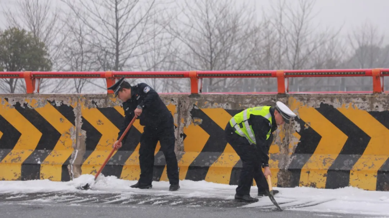 赫山公安分局衡龙桥派出所和交管赫山大队的民辅警在桥面铲除积雪。(图片来源:新闻宣传科)