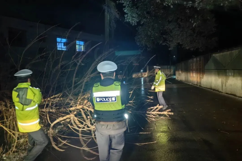 1月19日23时许,南县藕池河大堤树木断裂阻断通行,南县公安局交管大队民警徒手清理障碍。(图片来源:南县公安)