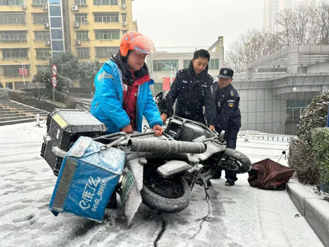 1月20日,一名外卖小哥在送餐的路上不慎滑倒,赫山公安分局民警帮助其扶起摩托车,叮嘱他注意出行安全。(图片来源:赫山公安)