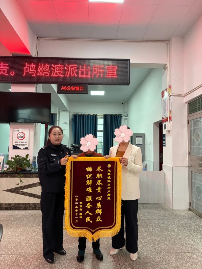 10月29日下午,群众刘女士和胡女士专程来到桃江县公安局鸬鹚渡派出所,将两面鲜红的锦旗送到民辅警手中,衷心感谢派出所帮助她们更正户籍年龄,化解了积压心头多年的身份烦恼。